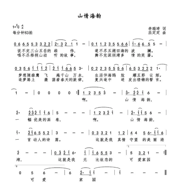 《山情海韻》歌詞大氣,飽含深情。作者以詩一般的語言為我們描繪了一幅幅優(yōu)美多姿的畫面,詮釋了深圳從一個小漁村發(fā)展成繁華大都市的壯闊景象,展現了年輕一代充滿活力、努力奮斗、只爭朝夕的精神面貌,催人奮進。