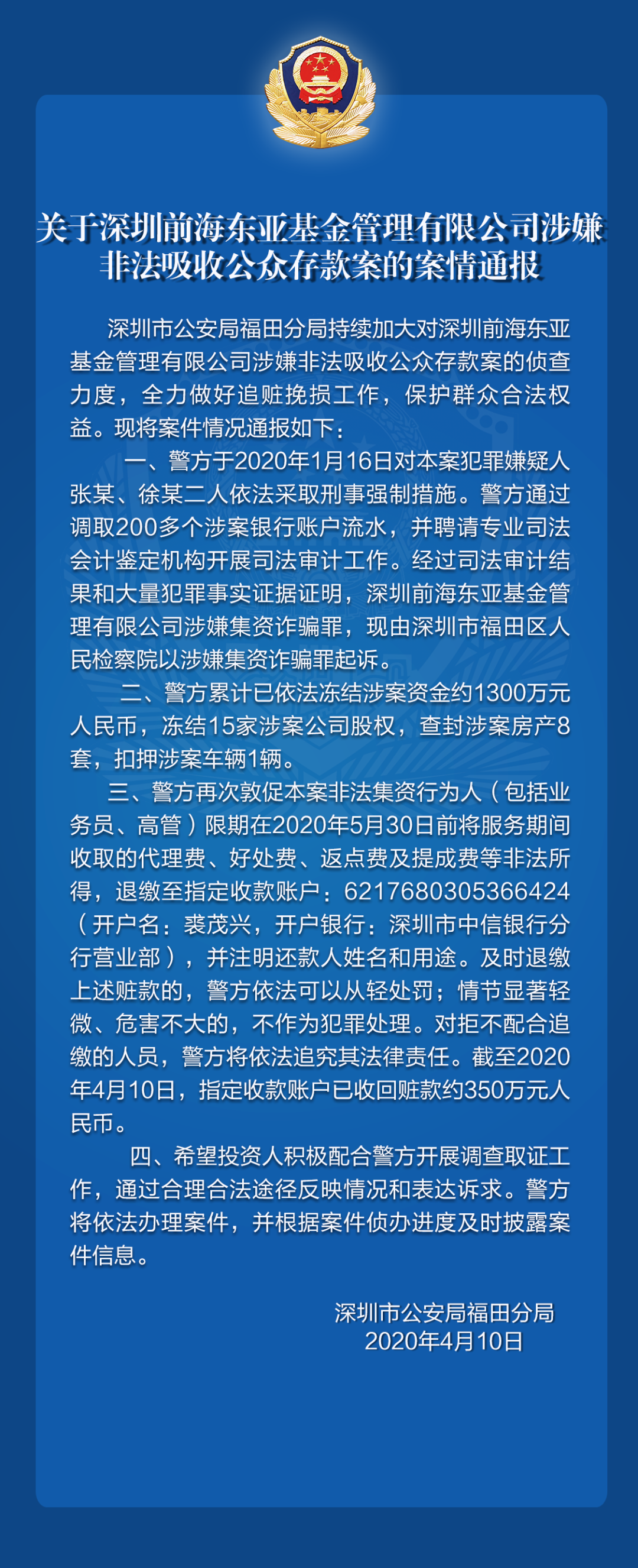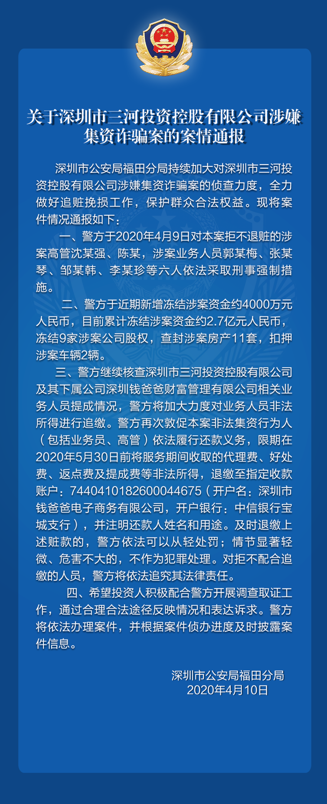 關于深圳前海東亞基金管理有限公司涉嫌非法吸收公眾存款、深圳市三河投資控股有限公司涉嫌集資詐騙的案件情況通報