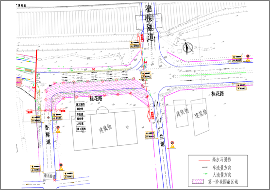 第一階段:對桂花路(福保隧道-香樟道段)南半幅(靠紅樹福苑側(cè))進行封閉占用施工,北半幅臨時調(diào)整為三車道,一車道西行(進保稅區(qū)方向),兩車道東行(出保稅區(qū)方向)。行人及非機動車輛可通過現(xiàn)狀公園側(cè)人行道或紅樹福苑退線空間通行。自4月20日起,本階段預(yù)計持續(xù)施工60天。