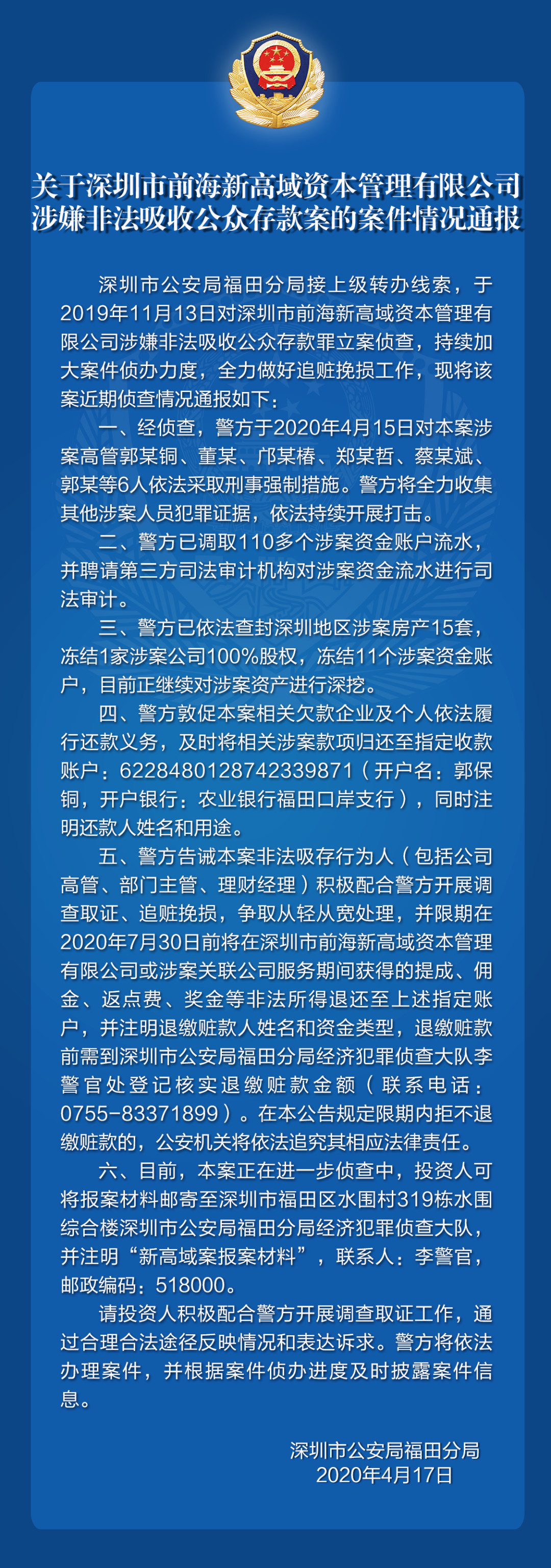 關(guān)于深圳市前海新高域資本管理有限公司涉嫌非法吸收公眾存款案的案件情況通報