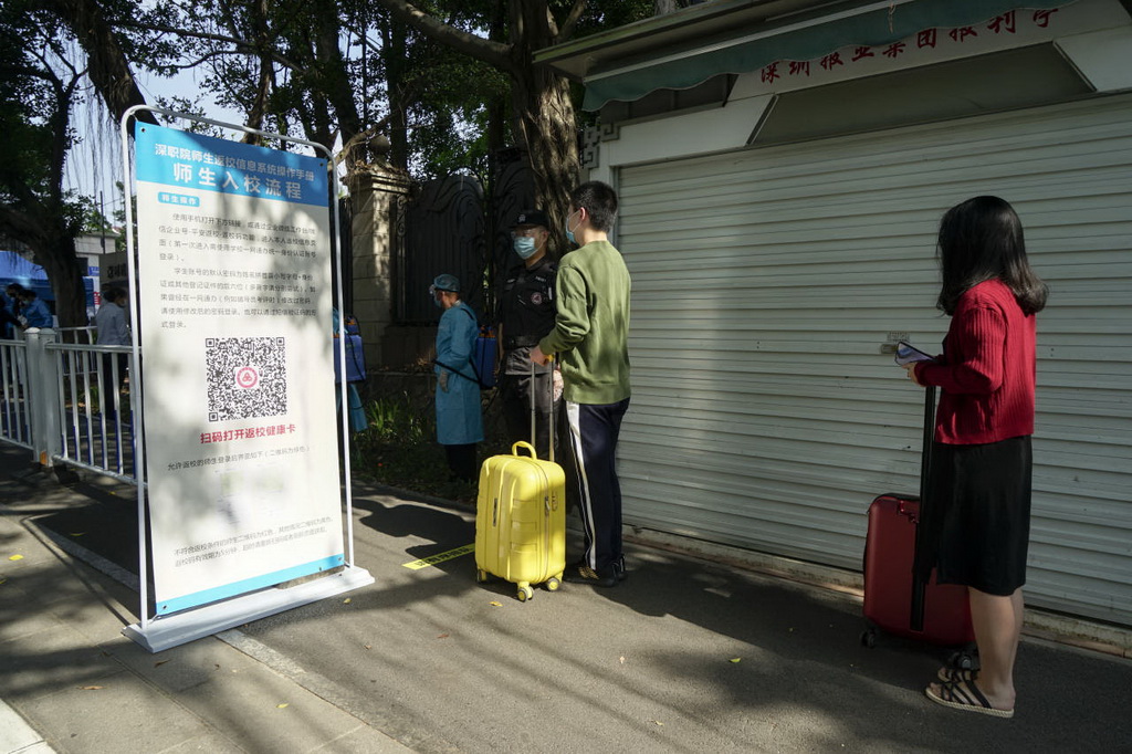 帶行李箱的學(xué)生走專用通道,依次完成掃碼核驗(yàn)、測(cè)量體溫等流程后進(jìn)入校園。