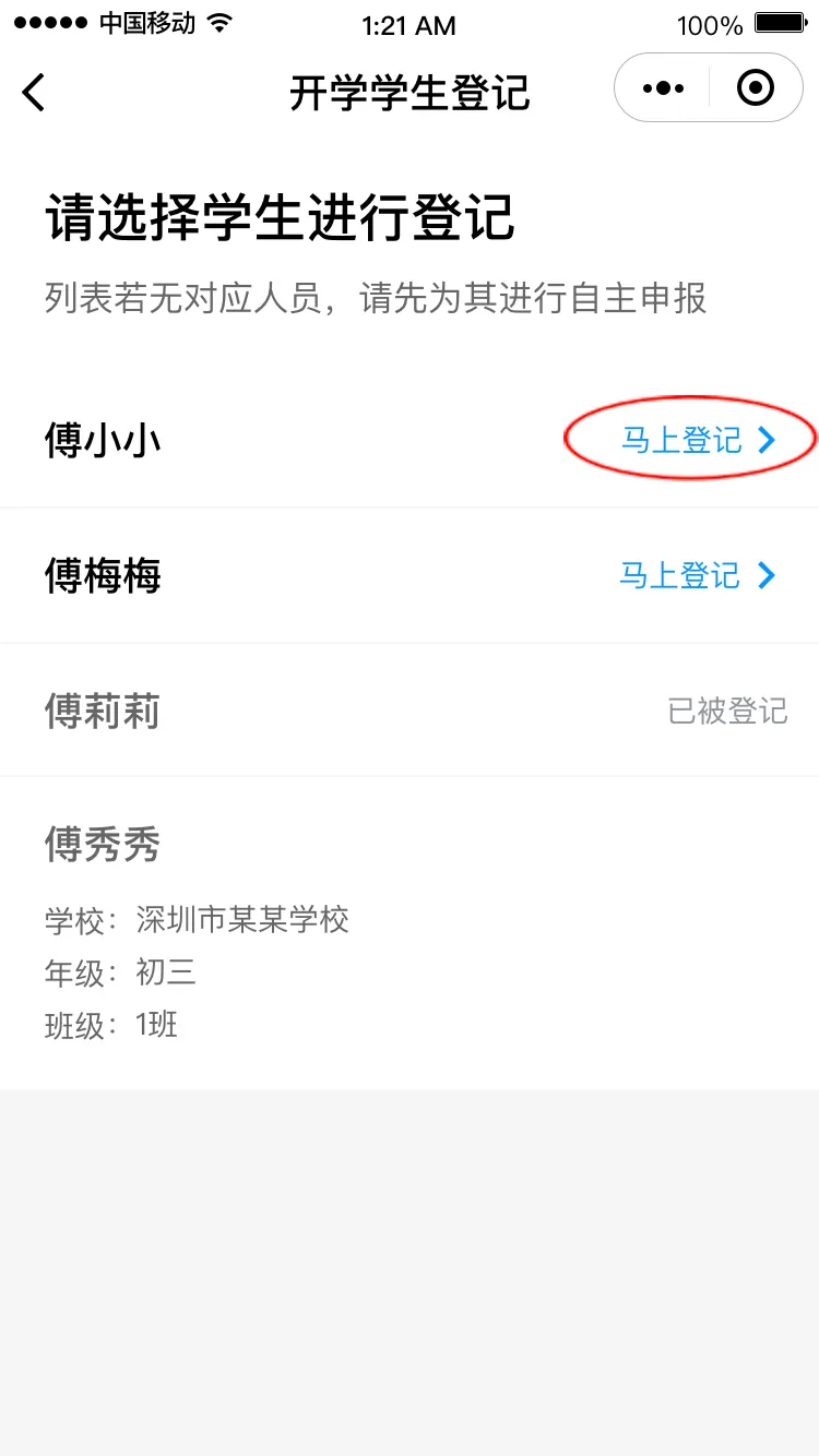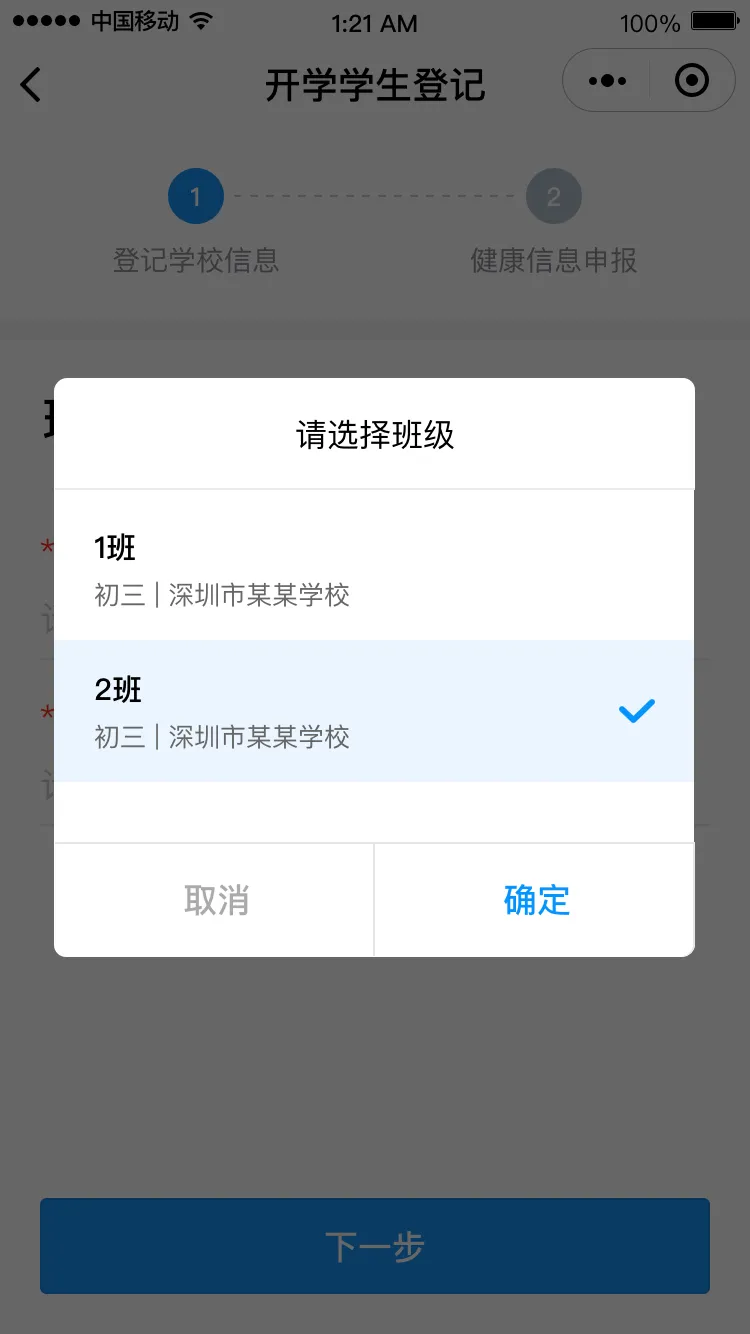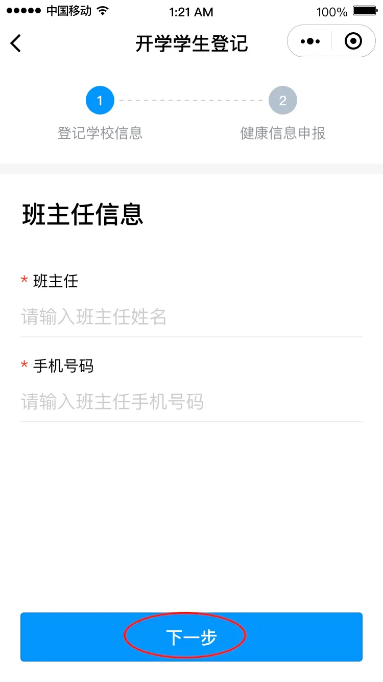 進(jìn)入“開學(xué)學(xué)生登記”頁面,點(diǎn)擊“馬上登記”進(jìn)入登記界面,填寫班主任姓名和手機(jī)號碼后點(diǎn)擊“下一步”,請選擇對應(yīng)的班級,進(jìn)入健康申報卡界面。