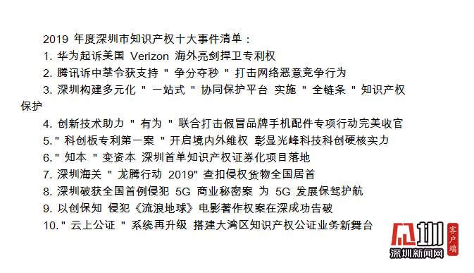 值得關(guān)注的是,在深圳市知識產(chǎn)權(quán)工作會議期間,全市2019年度知識產(chǎn)權(quán)十大事件正式對外發(fā)布,華為起訴美國Verizon、騰訊訴中禁令獲支持、“有為”聯(lián)合打擊假冒品牌手機配件專項行動完美收官等事件上榜。