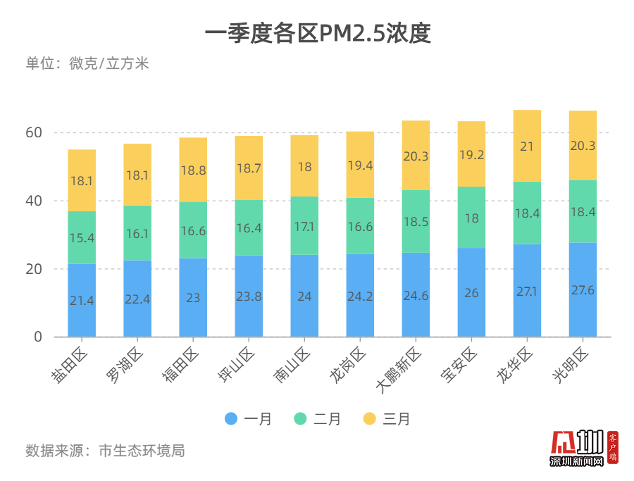 記者從深圳市生態(tài)環(huán)境局獲悉,2020年3月,全市74個(gè)街道PM2.5濃度在14.6-24.3微克/立方米之間,均值為19.0微克/立方米。