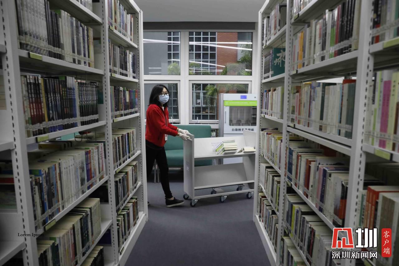 一位工作人員正在將需要上架的書籍推到指定位置。