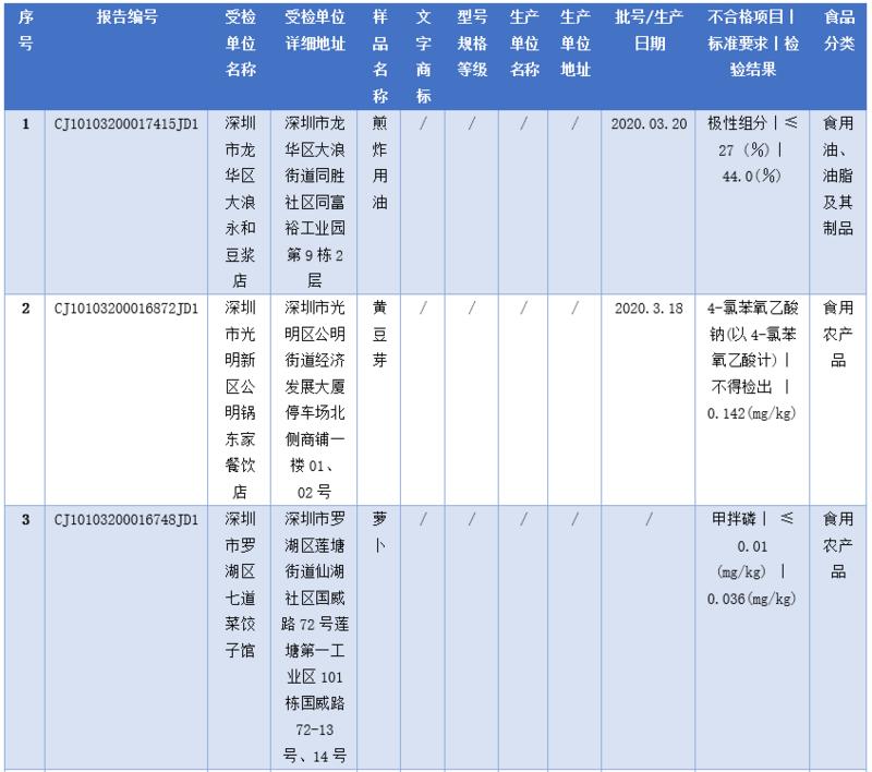 見(jiàn)圳客戶端·深圳新聞網(wǎng)2020年5月1日訊(深圳特區(qū)報(bào)記者 楊德琦)4月30日,深圳市市場(chǎng)監(jiān)督管理局發(fā)布第十四期食品安全抽樣檢驗(yàn)情況通報(bào),3月共抽檢餐飲環(huán)節(jié)食品1009批次,涉及餐飲環(huán)節(jié)經(jīng)營(yíng)主體919家次,共檢測(cè)食品指標(biāo)6347項(xiàng)次。其中不合格樣品8批次,涉及不合格食品類別有食用農(nóng)產(chǎn)品6批次,黃豆芽、蘿卜、雞蛋、油麥菜、牛蛙等在列;餐飲食品1批次,為即食白米飯;食用油、油脂及其制品1批次,為煎炸用油。涉及不合格項(xiàng)目類別為獸藥殘留、農(nóng)藥殘留、非食用物質(zhì)、微生物污染、品質(zhì)指標(biāo)。