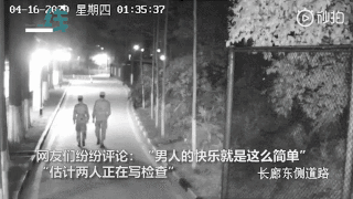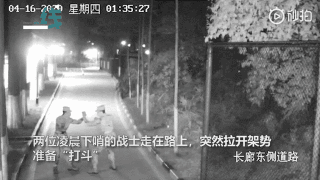 兩位凌晨下哨的戰(zhàn)士走在路上,突然間拉開架勢,準備“打斗”。劍拔弩張之際,突然畫風一轉,兩人做起了互相加油打氣的動作。