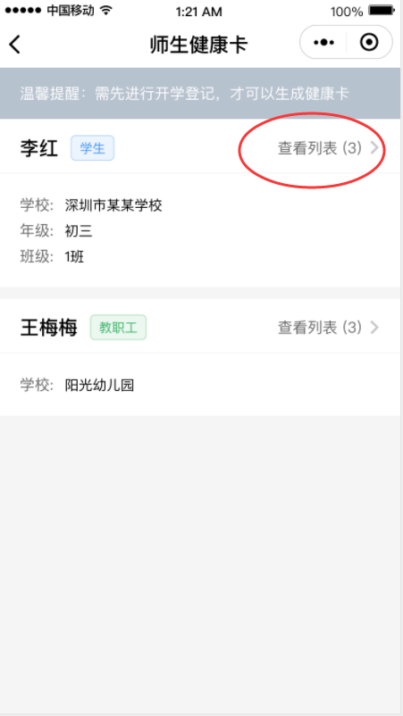 在開(kāi)學(xué)專區(qū)點(diǎn)擊“師生健康卡信息”,然后點(diǎn)擊“查看列表”,可查看您的健康申報(bào)記錄,點(diǎn)擊“重新生成健康卡”進(jìn)行更新。