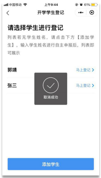 ①點(diǎn)擊“學(xué)生登記”,進(jìn)入開(kāi)學(xué)學(xué)生登記列表,展示申報(bào)人員列表,選擇對(duì)應(yīng)的人員進(jìn)行取消登記。