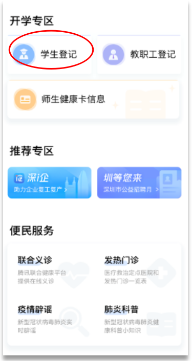 ①在首頁(yè)開(kāi)學(xué)專區(qū),點(diǎn)擊“學(xué)生登記”進(jìn)入申報(bào)人員列表,進(jìn)行自主申報(bào)和實(shí)名認(rèn)證,再進(jìn)行開(kāi)學(xué)登記。