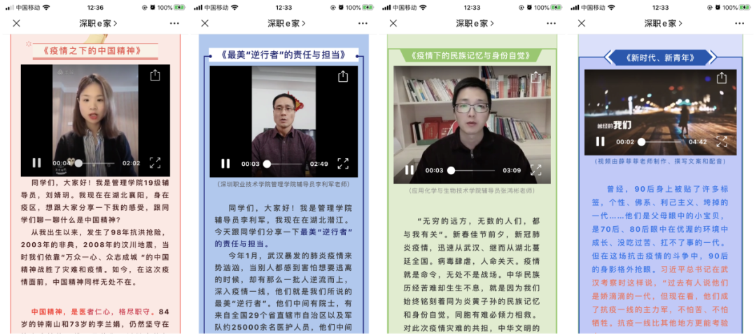 深圳職業(yè)技術(shù)學(xué)院學(xué)生工作部組織33位青年輔導(dǎo)員,推出33講戰(zhàn)“疫情”系列微課程,每天8:30準(zhǔn)時(shí)推送。微課程主題涵蓋愛(ài)國(guó)主義教育、理想信念教育、生命教育、社會(huì)責(zé)任感教育、感恩教育,不同的主題、不同的視頻、不同的感悟,輔導(dǎo)員老師和同學(xué)們一起在戰(zhàn)“疫”中成長(zhǎng),為同學(xué)們講述每一個(gè)戰(zhàn)“疫”的感人故事。建環(huán)學(xué)院輔導(dǎo)員薛菲菲老師制作精美短視頻、撰寫文案、配樂(lè)、配音,以有思想又有溫度的方式與學(xué)生對(duì)話。她說(shuō),磨煉是成長(zhǎng)的催化劑,抗疫是時(shí)代給予的成人禮,經(jīng)此一役,中國(guó)的年輕人們對(duì)責(zé)任和奉獻(xiàn)的感受更加直觀,對(duì)勇敢和擔(dān)當(dāng)?shù)睦斫飧由羁?,而中?guó),也因?yàn)?0后,收獲了青春洋溢的蓬勃力量!
