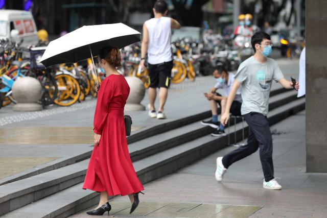 ▲走在街上,熱浪撲面而來(lái),耀眼的陽(yáng)光把人曬得睜不開眼,行人紛紛拿起手頭物品遮擋烈日。