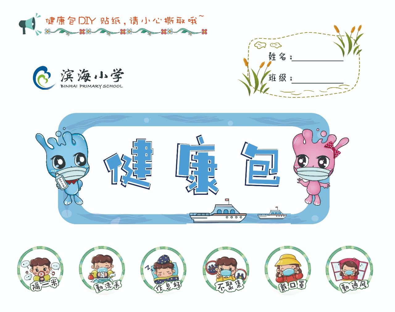 《健康包》,也是學校精心為返校的學生準備的一份健康防疫小禮包,里面有臂貼、DIY貼紙等!這些萌萌的DIY貼紙,可以根據(jù)孩子們的個性需求和遵守情況,自由拼貼!學校通過這些充滿童趣的設計,讓孩子們將防護措施牢記于心!