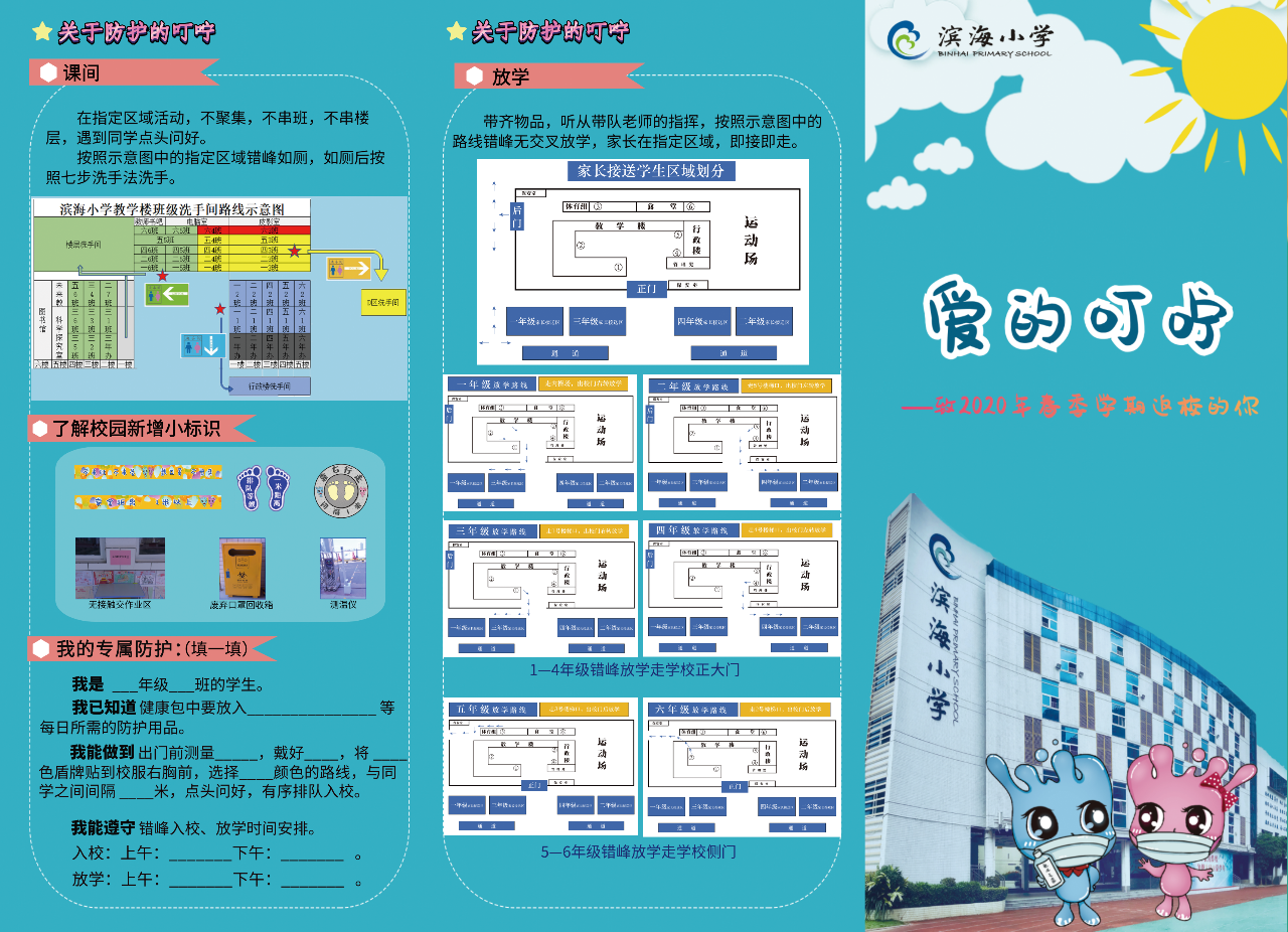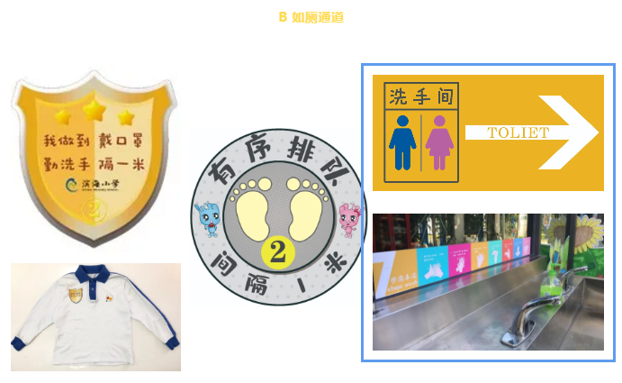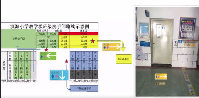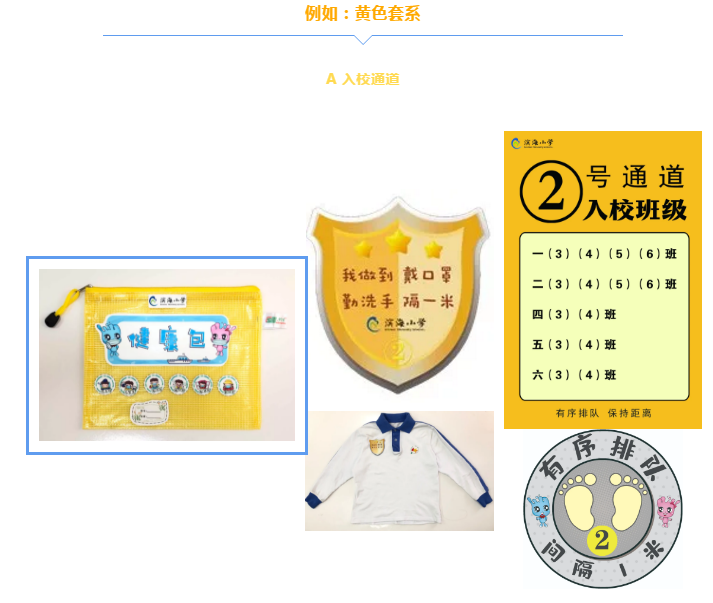 學校將教學區(qū)劃分為“綠黃藍”三區(qū),并精心設計了帶有濱海元素的“三色”入校通道、三色盾牌、三色貼紙等!