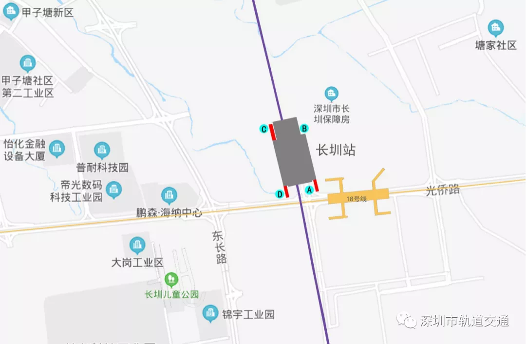 其中,A、B出入口位于光明大道東側(cè),C、D出入口位于光明大道西側(cè)。A出入口與龍光玖龍臺項目連通,C、D出入口與特區(qū)建發(fā)樂府廣場項目連通。