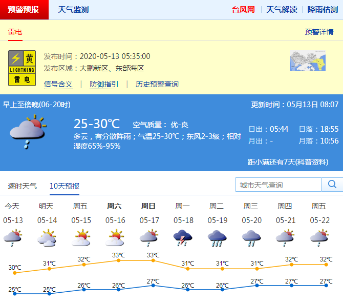 預(yù)計13日多云間陰天,氣溫24-29℃;14-17日多云到晴天,局部偶有短時陣雨或雷陣雨,最高氣溫可達32-33℃,天氣漸趨悶熱;展望18-19日有一次明顯降雨過程。