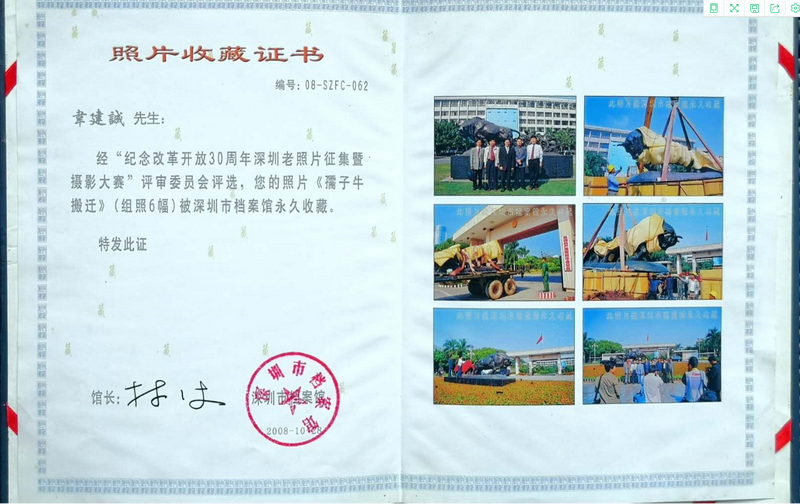 “一開始,我提出這個遷移建議時(shí),還是有點(diǎn)忐忑的,后來得知‘孺子?!袼軐⒁浦潦形笤和夂?,我非常高興,這樣一來,跟‘孺子牛’合影就方便多了呀!”“孺子?!钡袼苓w移當(dāng)天,韋建誠興奮地拿起相機(jī),用鏡頭定格下整個搬遷過程?!澳且惶焓俏胰松铍y忘的日子之一,既是我44歲生日,又是‘孺子牛’雕塑安新家之日?!被貞浧甬?dāng)時(shí)的情況,韋建誠還是十分興奮。而韋建誠拍攝的組照后來被深圳市檔案館永久收藏。深圳市委辦公廳還將《市民希望將“孺子?!钡袼芤浦潦懈笤和狻吩u為一等獎。