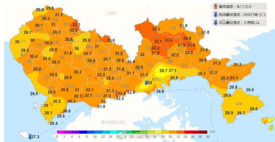 16日,粵北、粵東市縣多云間陰天,有分散的(雷)陣雨,其余市縣多云,局部有(雷)陣雨。全省大部最高氣溫介于33℃~36℃之間。