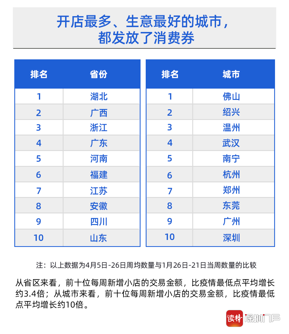 值得注意的是,排名前十的省份及城市,絕大多數(shù)都通過支付寶發(fā)放了消費券。4月份以來,佛山、珠海、東莞、清遠、深圳羅湖和龍崗區(qū)陸續(xù)通過支付寶等平臺發(fā)放消費券,廣東發(fā)放消費券總額已經(jīng)超過10億元,成為全國發(fā)放消費券最多的省份之一。尤其是上述排名第一的佛山,在市區(qū)兩級消費券刺激下,線下餐飲、美容美發(fā)等行業(yè)迎來一波消費熱潮。阿里本地生活數(shù)據(jù)顯示,自佛山消費券發(fā)布后,佛山線下餐飲門店新開業(yè)環(huán)比增幅超過35%,餐飲類消費訂單量環(huán)比增幅也超過了152%,美容美發(fā)訂單增長了350%以上。