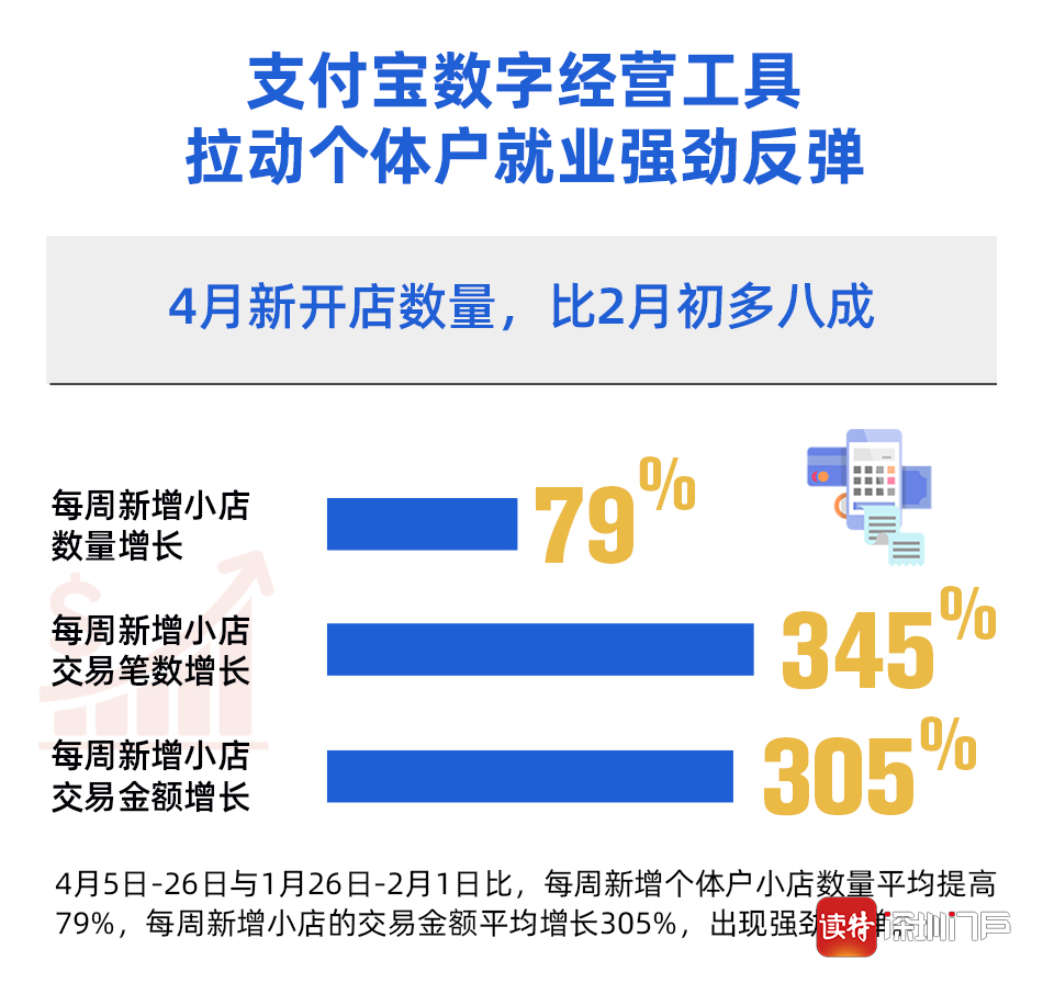 北京大學(xué)數(shù)字金融研究中心通過分析支付寶最新數(shù)據(jù)發(fā)現(xiàn),與疫情中最低點相比,全國個體戶就業(yè)形勢已出現(xiàn)強勁反彈:隨著復(fù)工復(fù)產(chǎn)的全面推進和消費券的發(fā)放,4月以來與疫情最低點2月1日當(dāng)周相比,每周新增個體戶小店數(shù)量平均提高79%,每周新增小店的交易金額平均增長305%。