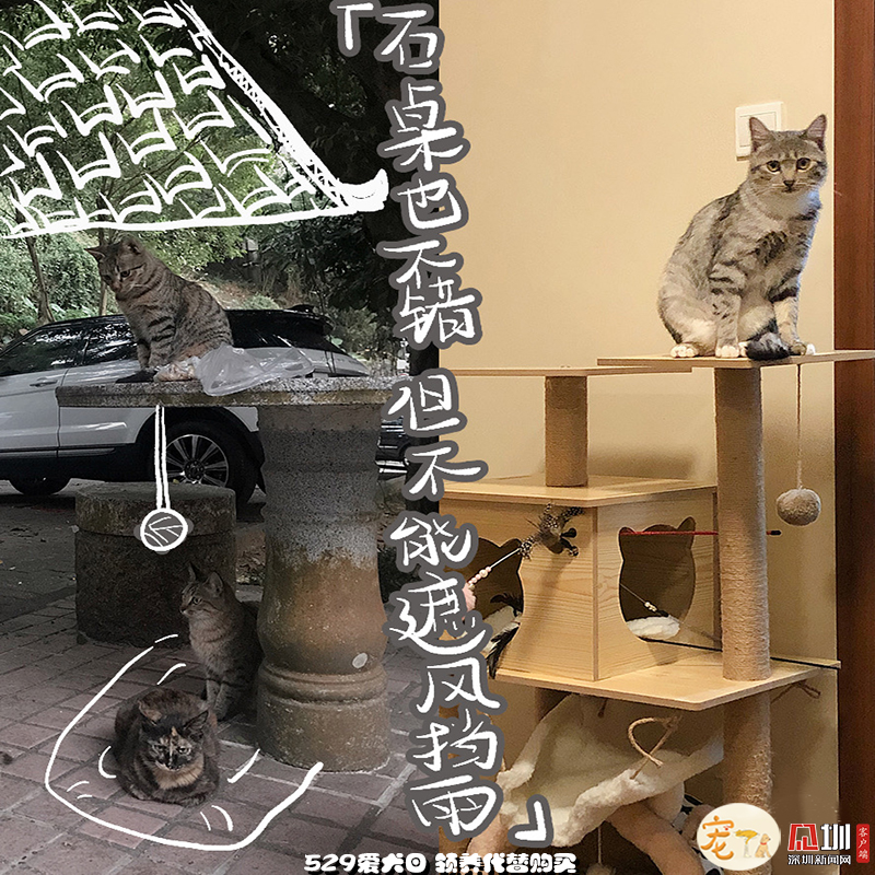 外面的世界再精彩,也比不過一個能遮風擋雨,沒有車流、毒藥威脅,三餐穩(wěn)定、四季如春的容身之處,更何況,這里還有比石桌更有趣的貓爬架和比落葉更好玩的小玩具。現(xiàn)在“高高在上”“作威作?!钡呢堖洌彩腔ü饬艘簧羞\氣,才能在無法獨自生存的小時候,遇見一個愿意照顧TA一生的“兩腳獸”。