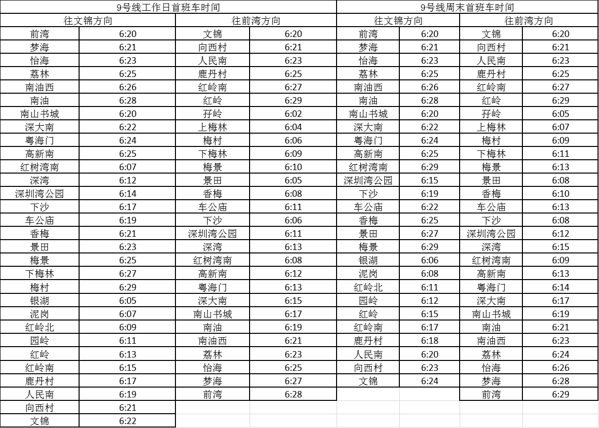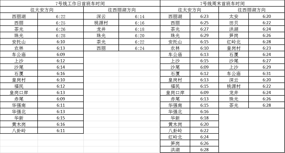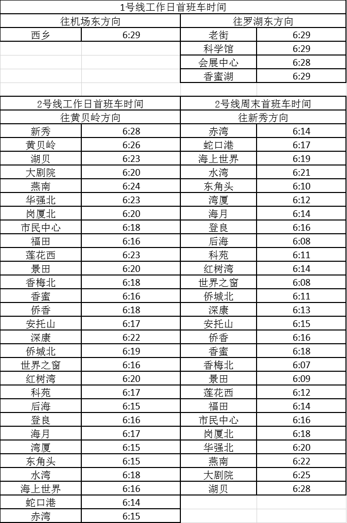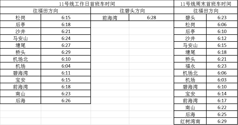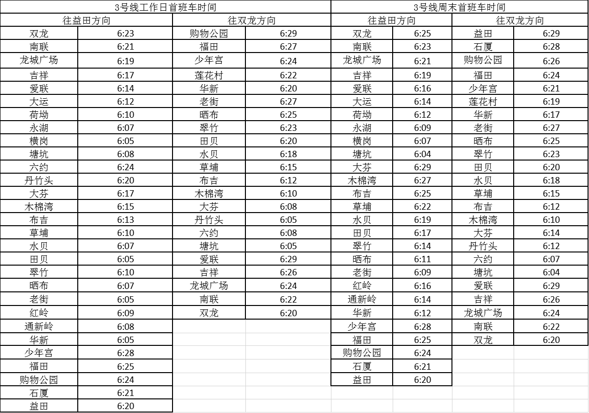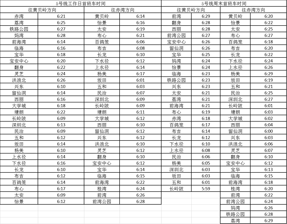 記者獲悉,經(jīng)優(yōu)化調(diào)整后,各線路工作日首班車最早發(fā)車站點(diǎn)及時間分別為,1號線老街站6:29、2號線蛇口港站6:14、3號線塘坑站6:05、5號線坂田站6:01、7號線赤尾6:09、9號線銀湖6:05、11號線機(jī)場站6:04。周末期間首班車最早發(fā)車站點(diǎn)及時間分別為,2號線香梅北站6:07、3號線塘坑站6:04、5號線長嶺陂站6:00、7號線皇崗口岸站6:09、9號線孖嶺站6:05、11號線機(jī)場站6:03。
