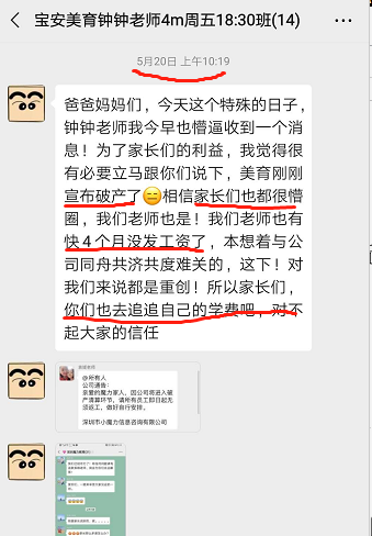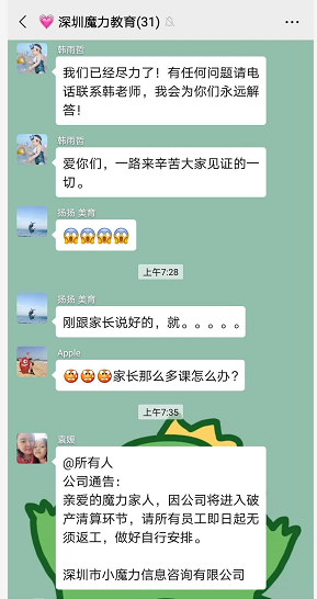 一名丁姓家長介紹,5月20日,家長接到美育老師消息,稱公司剛剛宣布破產(chǎn),老師工資被拖欠4個月。家長介紹,老師曝光該消息后,培訓(xùn)機(jī)構(gòu)支付了他們的拖欠工資。隨后大量老師離職。