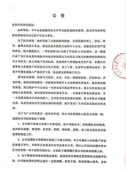 公司6月5日對家長發(fā)的公告。家長提供
