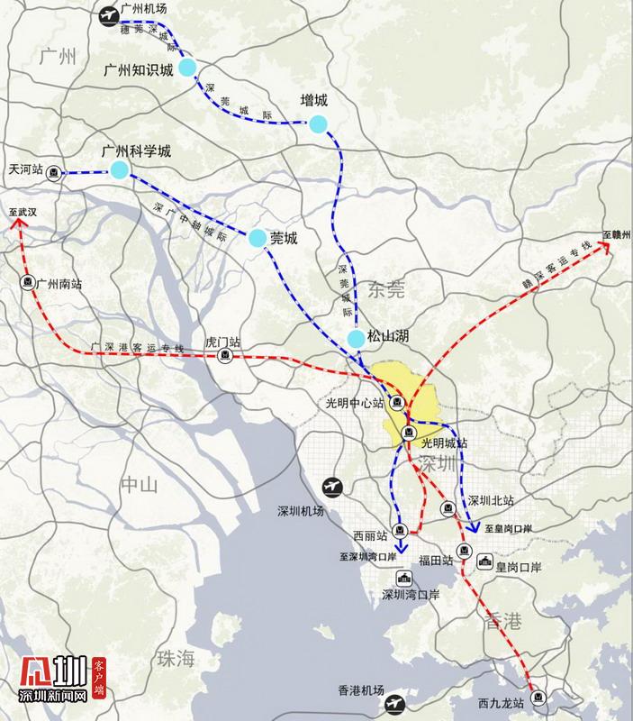 完善產(chǎn)學(xué)研結(jié)合的共享服務(wù)。光明科學(xué)城將建設(shè)產(chǎn)業(yè)服務(wù)中心和產(chǎn)業(yè)創(chuàng)新轉(zhuǎn)化服務(wù)平臺(tái),鼓勵(lì)企業(yè)開(kāi)放圍墻,增加沿街界面,鼓勵(lì)土地混合利用,提升產(chǎn)城融合水平,增加城市活力,促進(jìn)產(chǎn)業(yè)創(chuàng)新。在交通網(wǎng)絡(luò)方面,光明科學(xué)城依托中深惠城際、深莞城際和城市軌道,加強(qiáng)與深圳寶安國(guó)際機(jī)場(chǎng)、廣州白云國(guó)際機(jī)場(chǎng)的快速聯(lián)系;依托廣深港客專、深莞城際、深廣中軸城際和城市軌道,加強(qiáng)與香港西九龍口岸、深圳灣口岸、皇崗口岸、福田口岸等的便捷聯(lián)系;加快深廣中軸城際、深莞城際軌道規(guī)劃建設(shè),推動(dòng)深莞城際與深廣中軸城際、中深惠城際、中虎龍城際和莞惠城際的“互聯(lián)互通”。