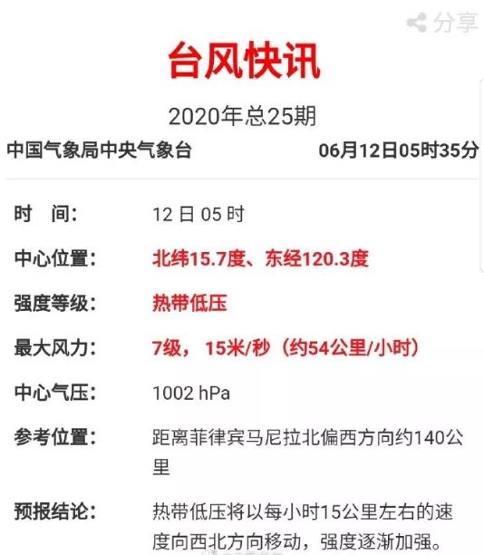 據(jù)@中央氣象臺,目前位于菲律賓呂宋島西部熱帶低壓即將移入南海東部海面,強度逐漸增強,12小時內(nèi)將發(fā)展成為今年第2號臺風(fēng)鸚鵡,并將于14日白天在廣東西部一帶沿海登陸(23-28米/秒,熱帶風(fēng)暴級或強熱帶風(fēng)暴級),登陸后強度逐漸減弱。