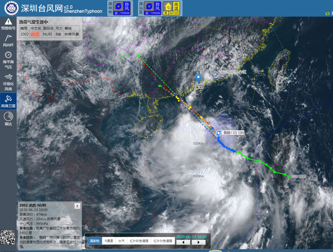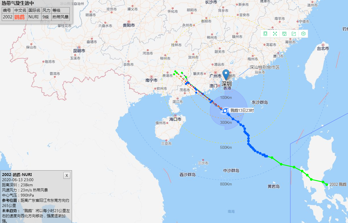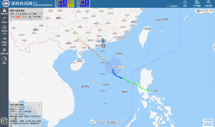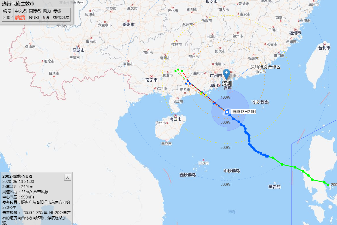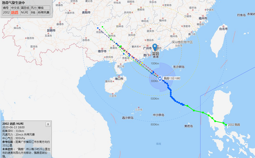 深圳市氣象臺(tái)2020年06月13日15時(shí)30分發(fā)布:6月13日15時(shí)臺(tái)風(fēng)“鸚鵡”(熱帶風(fēng)暴級(jí))位于深圳市偏南方約387公里南海海面上,中心附近最大風(fēng)力8級(jí)。預(yù)計(jì)其將繼續(xù)向西北方向移動(dòng),14日白天趨向江門至茂名海域,最大可能以強(qiáng)熱帶風(fēng)暴級(jí)在陽江附近登陸。我市13日17時(shí)后起風(fēng)力逐漸加大,13日夜間至14日上午為風(fēng)雨主要影響時(shí)段,有大雨到暴雨,沿海和海區(qū)最大陣風(fēng)8-10級(jí)。目前臺(tái)風(fēng)藍(lán)色和雷電預(yù)警信號(hào)生效中。