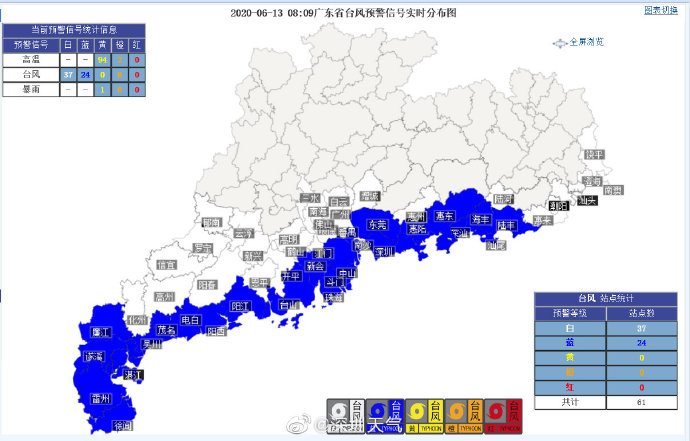 深圳市氣象臺(tái)于2020年06月13日07時(shí)15分將全市臺(tái)風(fēng)白色預(yù)警升級(jí)為藍(lán)色,預(yù)計(jì)受“鸚鵡”影響,今天傍晚起風(fēng)力逐漸加大,深圳市陣風(fēng)達(dá)8級(jí)以上,全市進(jìn)入臺(tái)風(fēng)戒備狀態(tài),落實(shí)各項(xiàng)防風(fēng)措施,及時(shí)組織戶外、高空、港口及海上作業(yè)人員做好防御工作。