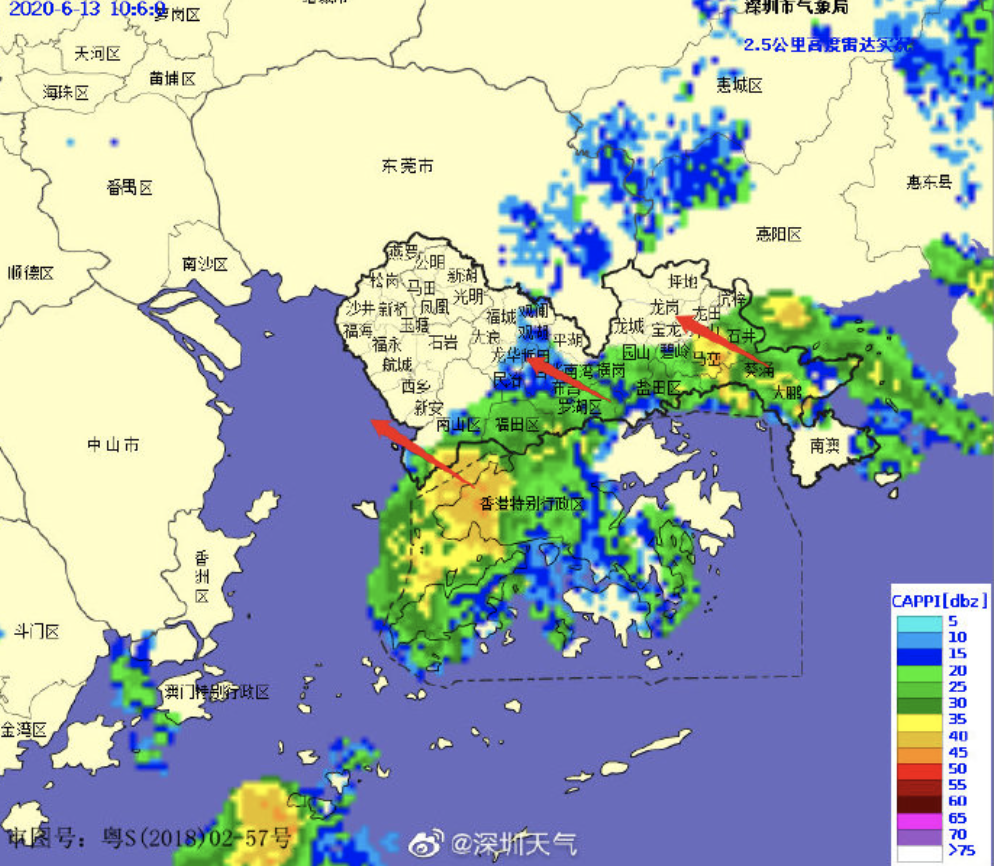 降雨云團(tuán)正在往西北方向移動(dòng),預(yù)計(jì)將會(huì)影響龍華、光明和寶安北部區(qū)域。