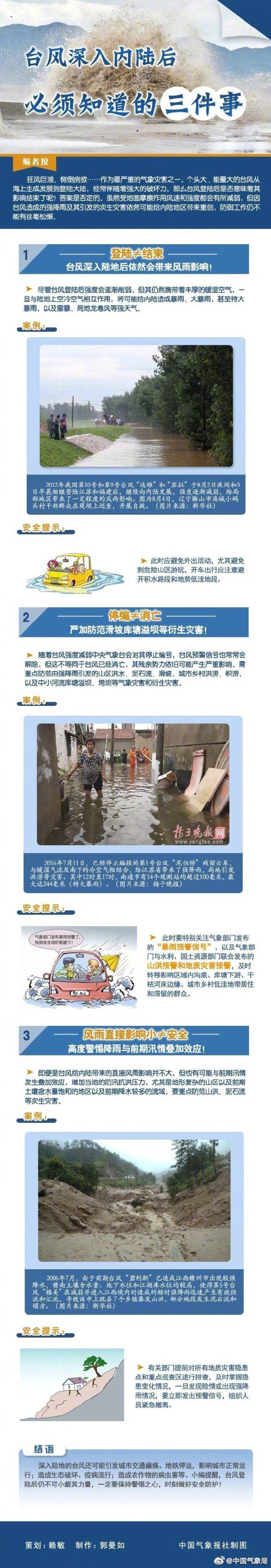3、風(fēng)雨直接影響小不等于安全。即便臺(tái)風(fēng)給內(nèi)陸帶來的直接風(fēng)雨影響不大,但可能與前期汛情疊加,產(chǎn)生泥石流等次生災(zāi)害。