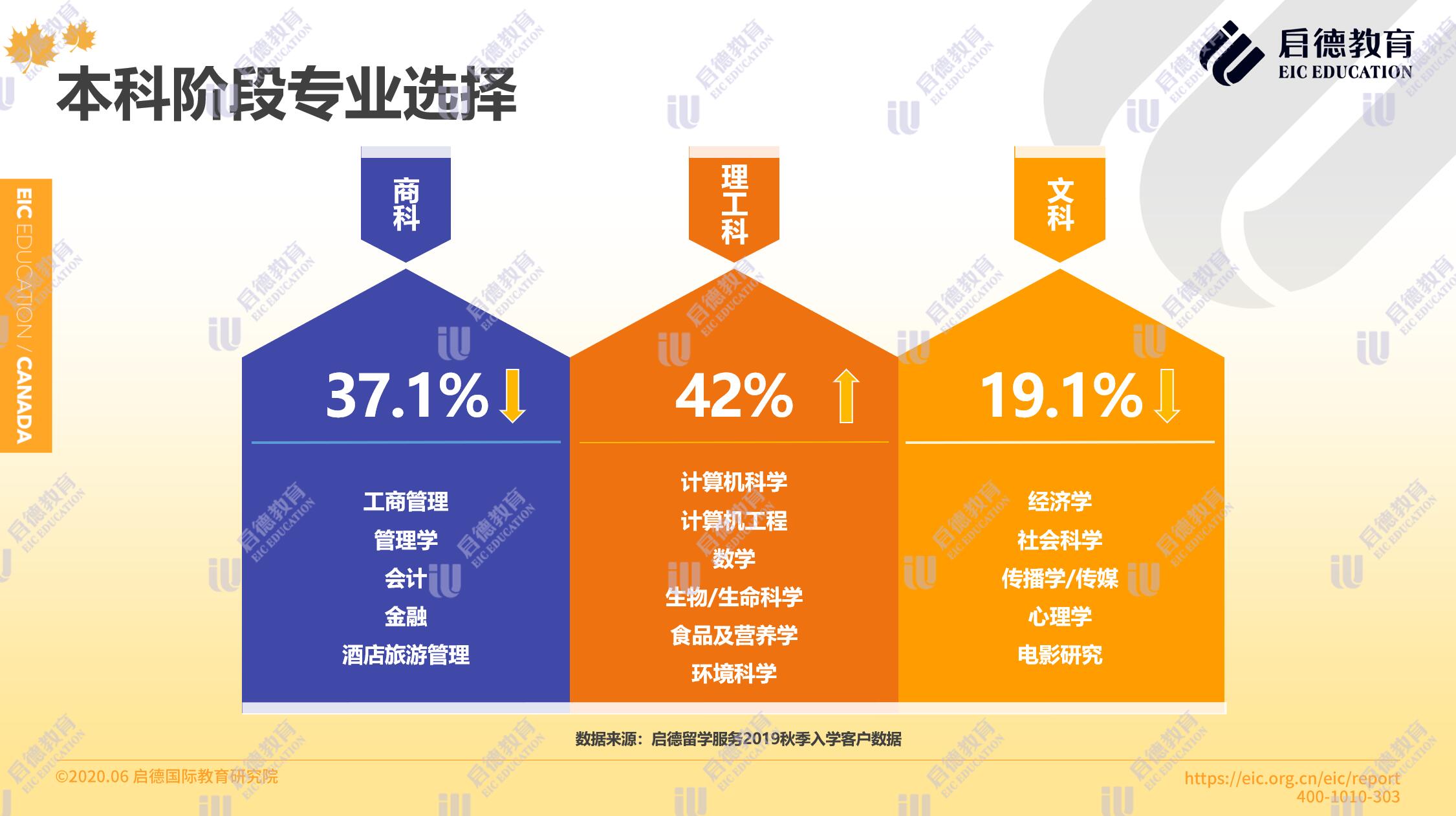 啟德留學(xué)服務(wù)2019秋季入學(xué)客戶數(shù)據(jù)顯示,在本科階段專業(yè)選擇理工科占比42%,商科占比37.1 %,文科19.1%,理工科的申請人數(shù)超過了商科。碩士階段選擇最多的專業(yè)是 MBA、教育學(xué)和計算機(jī),其他新興的跨學(xué)科專業(yè)包括滑鐵盧大學(xué)的數(shù)字科學(xué)與人工智能碩士,滑鐵盧大學(xué)的 MBET (商業(yè)、創(chuàng)業(yè)和技術(shù)專業(yè)),與麥克馬斯特大學(xué)的 MEEI (工程、創(chuàng)業(yè)與創(chuàng)新專業(yè))。
