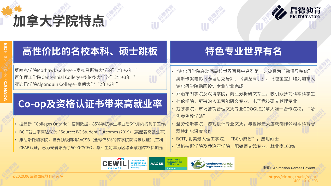 據(jù)最新“ Colleges Ontario”官網(wǎng)數(shù)據(jù),85 %的學(xué)院學(xué)生畢業(yè)后6個月內(nèi)找到了工作,91%的雇主對學(xué)生表示非常滿意。如康尼斯托加學(xué)院,擁有世界頂級商科 AACSB與工科 CEAB認(rèn)證,為安省培養(yǎng)了5000位 CEO,畢業(yè)生每年為區(qū)域貢獻(xiàn)超過23億加元。而奧斯卡獎電影《泰坦尼克號》、《馴龍高手》、《包寶寶》均為加拿大謝爾丹學(xué)院動畫設(shè)計專業(yè)畢業(yè)完成。北阿伯塔學(xué)院的納米技術(shù)專業(yè),杜倫學(xué)院的人工智能專業(yè),道格拉斯學(xué)院的配鏡師專業(yè),范莎學(xué)院的飛機(jī)維修專業(yè)也是世界有名的特色專業(yè)。