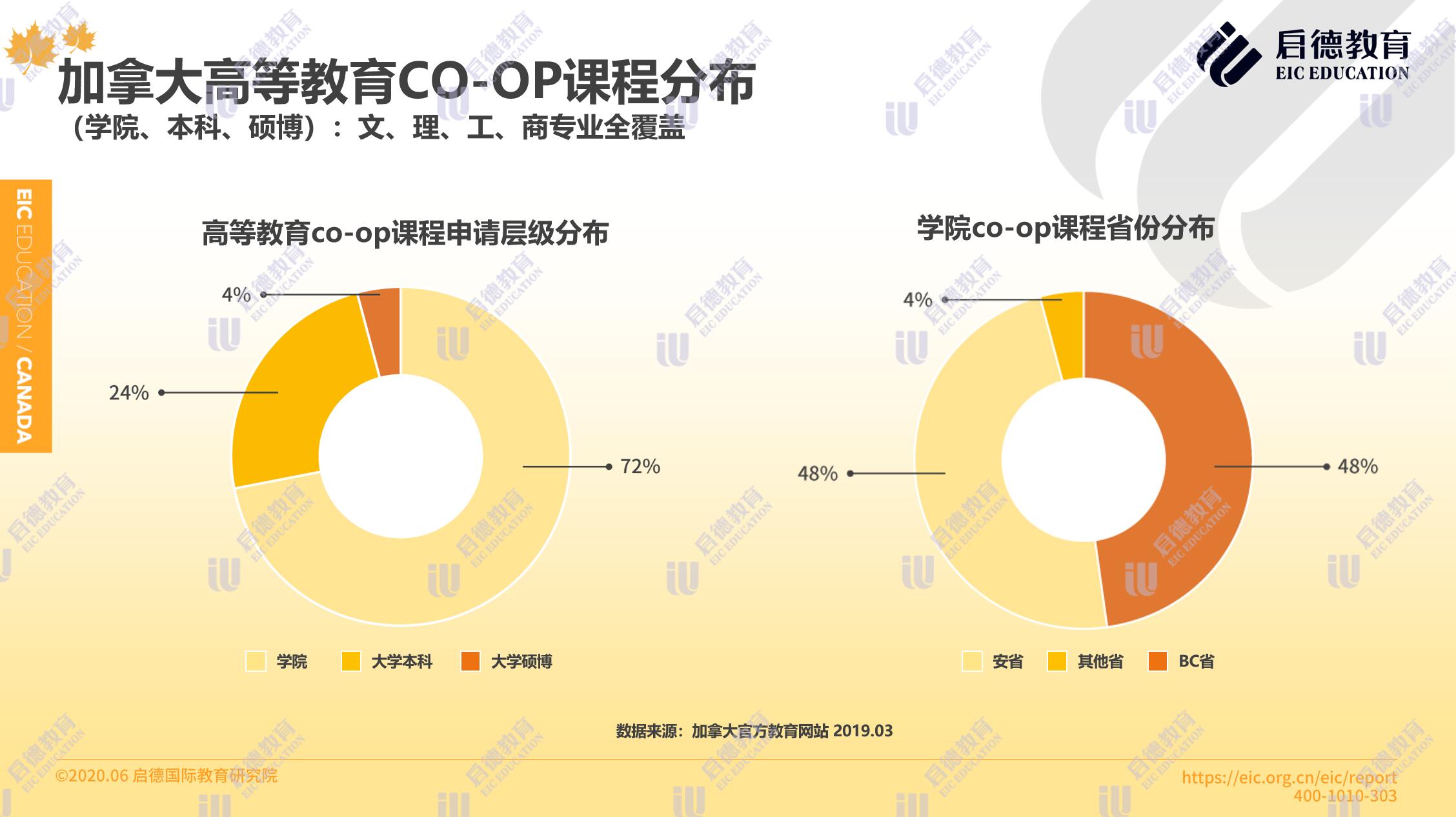 加拿大官方教育網(wǎng)站數(shù)據(jù)顯示,加拿大高等教育普遍開設(shè)覆蓋文、工、理、商全專業(yè)的 Co - op帶薪實習(xí)課程,其中學(xué)院的 Co - op課程占比最多(72% ),其次是大學(xué)本科(24% )與大學(xué)碩博(4% )。在學(xué)院 Co - op課程的省份分布上,安大略省與英屬哥倫比亞省平分秋色,各占48%。