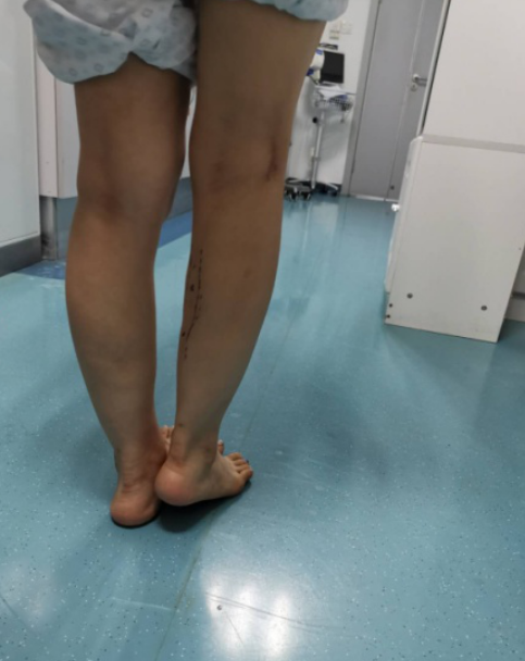 20歲出頭的楊柳(化名)右小腿注射肉毒素后發(fā)生肌肉攣縮,導(dǎo)致右足跟不能著地,雙下肢不等長(zhǎng),跛行。