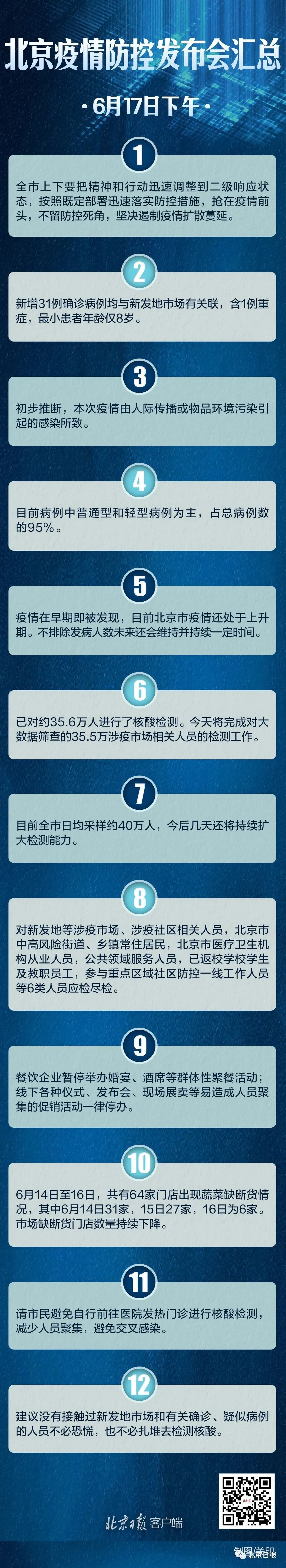 北京新冠肺炎疫情防控工作領導小組檢疫檢測工作組副組長、市委組織部副部長張強介紹,6月13日起,已迅速對新發(fā)地等出現(xiàn)疫情的市場人員、周邊小區(qū)居民、大數(shù)據(jù)排查涉疫市場人員,社區(qū)敲門行動中主動報告、有關接觸史的人員以及全市各農(nóng)貿(mào)市場工作人員約35.6萬人進行了核酸檢測。6月17日將完成對大數(shù)據(jù)篩查的涉疫市場相關人員的檢測工作,對重點行業(yè)、重點領域、重點地區(qū)人員的核酸檢測工作也在同步進行。