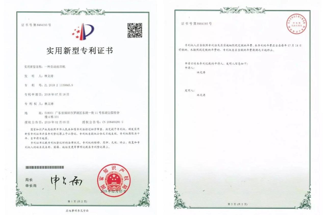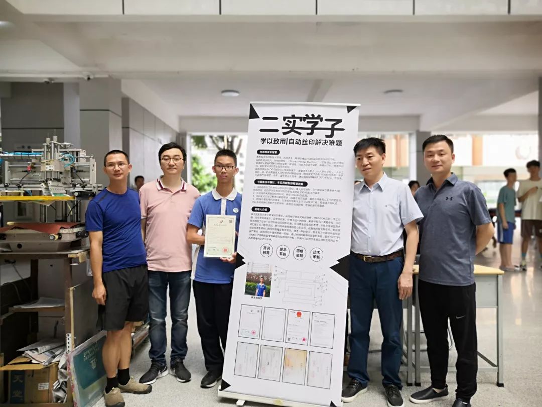 2019年12月,林文濤參加中國科協(xié)舉行的“全國青少年科技創(chuàng)新大賽”,獲得深圳市二等獎。他發(fā)明的成品雨傘自動絲印機,榮獲實用新型專利證書。這種自動絲印機,極大地提高了工作效率,在一把雨傘上印刷一個logo僅僅需要單人5秒的時間。