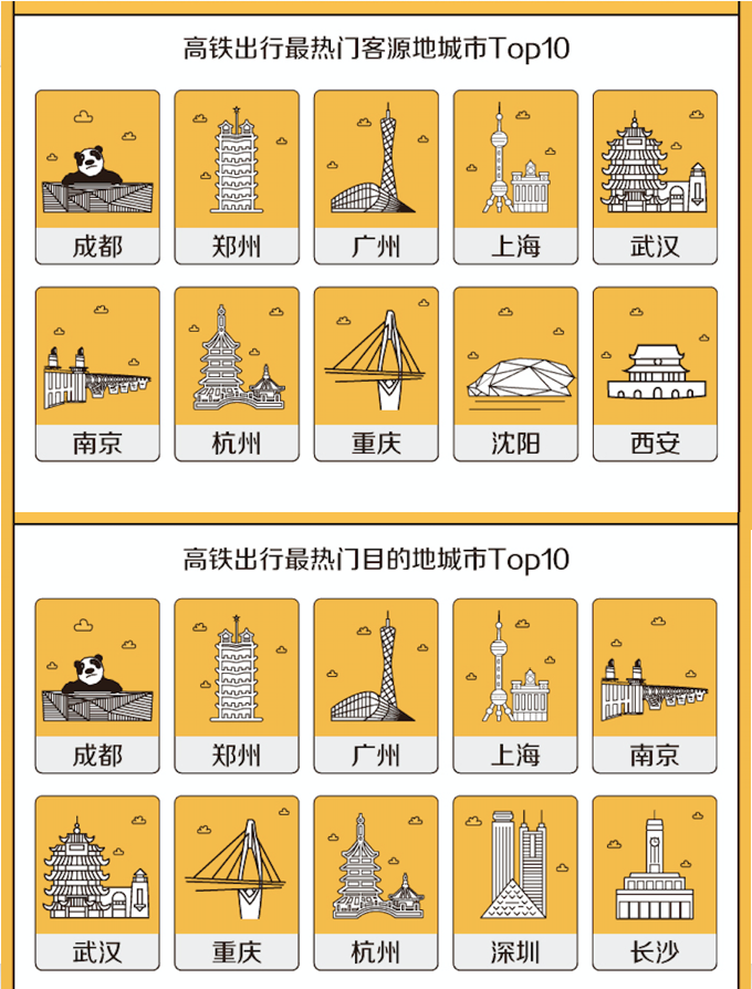 除此之外,城市周邊高鐵短途游受歡迎,特別是2小時內的高鐵行程受到家庭出游的青睞。比如,上海開往杭州、蘇州、南京;廣州開往深圳、東莞、珠海;成都開往重慶、綿陽、眉山;武漢開往孝感、襄陽、黃石等城市短途高鐵線路預定量排名靠前。