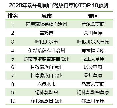 6月正是“草原游”較為適宜的時(shí)節(jié),廣袤的草原游可為這個(gè)夏天增添一絲清涼?!秷?bào)告》預(yù)測,端午小長假期間,全國熱門自駕草原TOP10主要分布在市郊,最熱門的是阿壩-若爾蓋草原,其次是寶雞-關(guān)山草原以及呼倫貝爾大草原。
