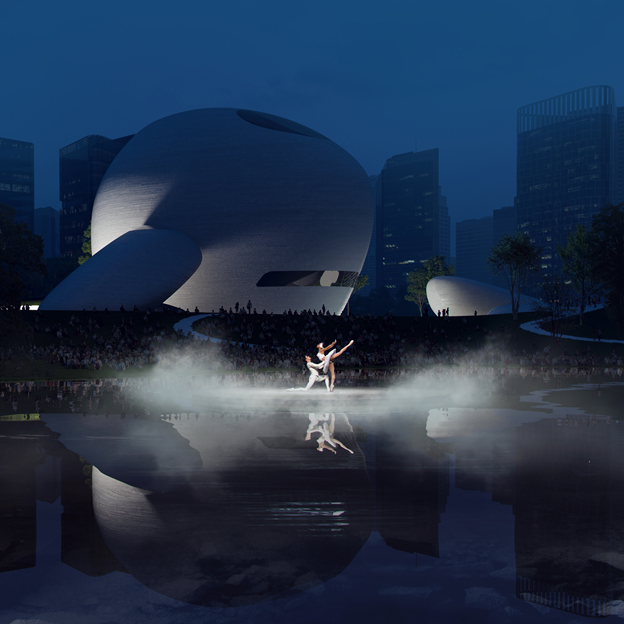 廣場(chǎng)中央的水池,可以作為劇場(chǎng),容納萬(wàn)人活動(dòng);景觀中預(yù)留出多處平臺(tái),提供公共藝術(shù)展覽、市集、藝術(shù)節(jié)、音樂(lè)節(jié)等戶(hù)外活動(dòng)場(chǎng)地;公園將城市的中軸線延續(xù)到海邊,行人步道、自行車(chē)道蜿蜒穿梭在建筑和草坪之間,為市民提供海濱休閑場(chǎng)地。