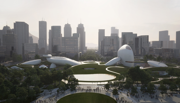 該項(xiàng)目由著名建筑師馬巖松帶領(lǐng)的MAD建筑事務(wù)所負(fù)責(zé)項(xiàng)目方案設(shè)計(jì)。方案顯示,將以“遠(yuǎn)古”和“未來(lái)”兩大概念,通過(guò)步道串聯(lián)起散落石群建筑、綠地、公共活動(dòng)區(qū),展現(xiàn)原始氛圍與未來(lái)力量的結(jié)合。在南館與北館兩個(gè)展館中間設(shè)有架空中軸景觀連橋,其中超高層的石群展廳將打造出炫目的展覽效果。此外,廣場(chǎng)還將連接深圳人才公園,形成一片連續(xù)的開(kāi)放空間。