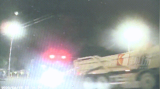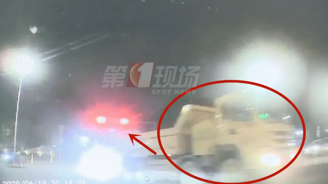 事故發(fā)生在6月19號晚上8點多,可以看到黑色小車在信號燈開始閃爍的時候開過光僑路路口,正好被一輛左轉泥頭車擋住了路。