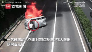 近日,重慶一面包車高速上突然失控,撞向護欄側(cè)翻,隨即起火,車內(nèi)3人被困。一名司機路過,上去4腳踹碎擋風玻璃,助3人脫困。