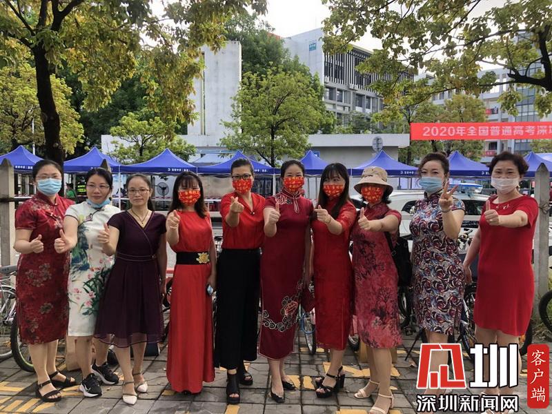 “以夢為馬,不負(fù)韶華,旗開得勝,馬到成功。”學(xué)生家長們身穿旗袍為孩子吶喊助威。