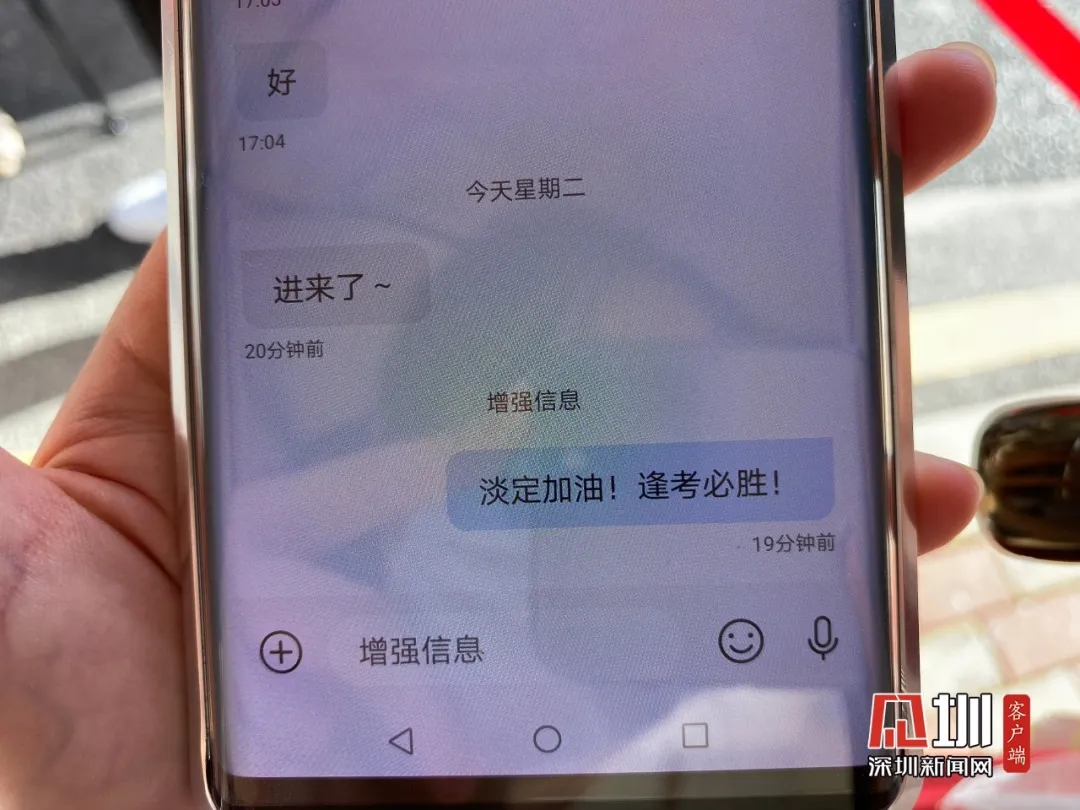今早,在深圳中學(xué)送考現(xiàn)場,陳女士向記者展示給孩子發(fā)的高考加油短信:淡定,加油,逢考必勝。