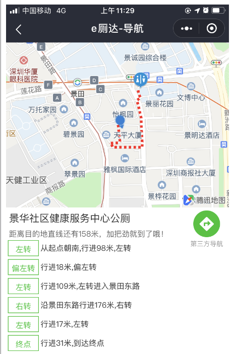第三個(gè)功能為導(dǎo)航找?guī)<热灰呀?jīng)查看到周邊有廁所分布,怎能不知道具體線路呢?“e廁達(dá)”中的“帶我去”按鈕可以輕松引領(lǐng)你去往定位的公廁。