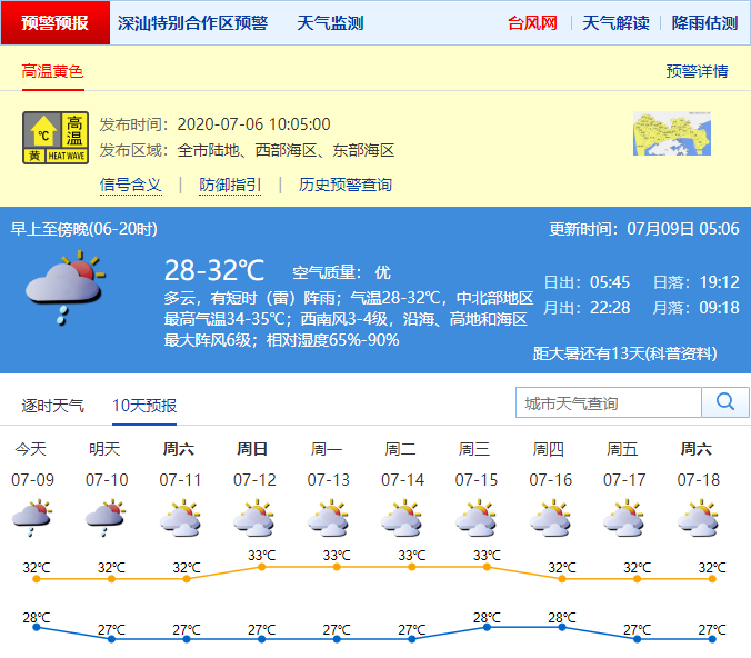 見圳客戶端?深圳新聞網(wǎng)2020年7月9日訊 根據(jù)深圳氣象局消息,深圳今日多云,有短時(shí)(雷)陣雨;氣溫28-32℃,中北部地區(qū)最高氣溫34-35℃;西南風(fēng)3-4級(jí),沿海、高地和海區(qū)最大陣風(fēng)6級(jí);相對(duì)濕度65%-90%。